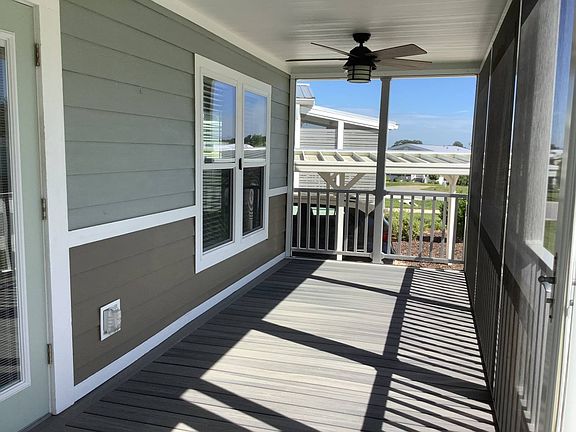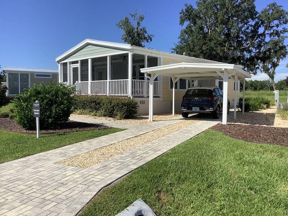 Owner motivated and willing to consider all offers!! Located in a beautiful gated community minutes to The Villages. This is a beautiful 2020 home with a spacious floor plan. The driveway is finished with pavers and river rock. A carport will keep your car out of the weather. Walk up to the fully screened in front porch with an upgraded fan and plenty of space to sit and enjoy the sun rise. The double front door can be opened up to enjoy the Florida sun in the cooler months. The open floor plan is spacious and inviting. Laminate flooring, crown molding, wide base board, upgraded ceiling fans, wooden valances and upgraded light fixtures throughout the home. In the kitchen you can enjoy your morning coffee at the breakfast bar. Stainless steel appliances. Set up your coffee bar or wine station. There is a food pantry and plenty of cupboards for all your needs. The living room has a tray ceiling and many windows to bring in the natural light. The laundry is located in the hallway concealed by bi-fold doors. Guest bathroom has a walk-in shower. Your primary bedroom has a closet with built in drawers underneath for plenty of clothing and storage. The en suite bathroom boasts a tiled walk in shower and a vanity with enough room to host your every day necessities. There are many cupboards for towels and toiletries. Now to your guest room where your guests can enjoy the beautiful view. A built in closet and drawers will give them plenty of room to unpack their suitcase and stay awhile. This room has a door out to the patio where friends can sit in the afternoon and enjoy views of the green space. A side walk done in pavers takes you to the back of the home where you can sit on the enclosed porch and enjoy a cold beverage. Enjoy the beautiful landscaping and this home in a gated community. A monthly amenity and utility fee includes all amenities, drip irrigation, water, lawn service, Spectrum cable, wi -fi, and garbage disposal. Amenities include a pool, exercise room, tennis courts and a community garden. This community is a hidden gem located on a lake close to shopping, entertainment, medical facilities and The Villages.