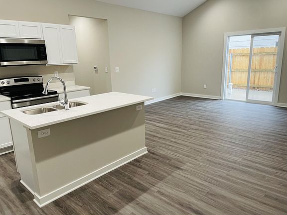 Side yardGranite countersDryer hookupsStainless kitchen appliancesWhite cabinetryOpen floor plan