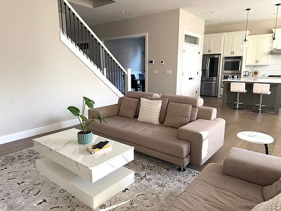 This modern 5/6-bedroom, 3.5-bathroom home in Creekview Ridge combines space, comfort, and high-end finishes with the ease of a fully furnished setup. Built in 2022 and loaded with over $50,000 in upgrades, the home features a bright, open layout with 10-foot ceilings on the main floor and beautiful wood flooring throughout. The living room is cozy and inviting, complete with a plush sofa and a fireplace that anchors the space. Just steps away, the kitchen has everything you need from stainless steel appliances to a small center island, barstools for casual dining, and plenty of storage, making it a great hangout spot for meal prepping or entertaining. The high-end appliance with double oven will make your cooking even more enjoyable.