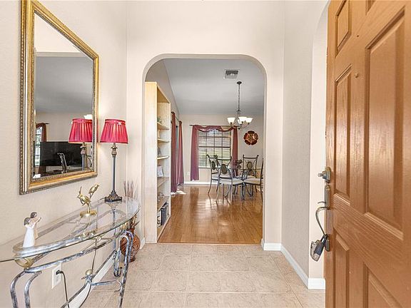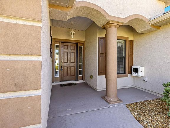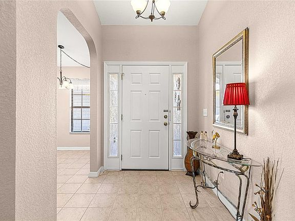 Welcome to this well-maintained 3/2 Sycamore floor plan located in the highly desirable 55 plus community of Stonecrest, just minutes from The Villages, a golf cart ride to shopping, dining, and entertaining. From the moment you arrive, you'll appreciate the home's painted driveway and sidewalks, concrete landscape curbing, and gutters and down spouts that enhance its curb appeal. Step inside to a welcoming tile foyer that leads into an open kitchen overlooking the combination living room and dining room. The kitchen features maple cabinetry with pull-outs, believed-edge laminate countertops, recessed lighting, and black stainless appliances including a refrigerator, microwave, oven, and eat-in area. The living and dining room combination offers easy-to maintain laminate flooring, while the guest bedrooms are comfortably carpeted. The guest bath features maple cabinets, tile flooring and a walk-in shower. Retreat to the spacious primary suite, which includes a large walk-in closet, carpeted floors, and a primary bath with a step-down shower, soaking tub, and double maple vanity with cultured marble top. Additional highlights include an inside laundry room with cabinetry and pantry storage, an epoxy finished garage floor with slop sink, and a screen enclosed back porch with birdcage enclosure-ideal for relaxing or bug-free outdoor entertaining. Major updates provide peace of mind, like new roof (2022) and new HVAC (2022). This home combines quality, comfort, and convenience in one of the area's premier active-adult communities. This home can also be available furnished.