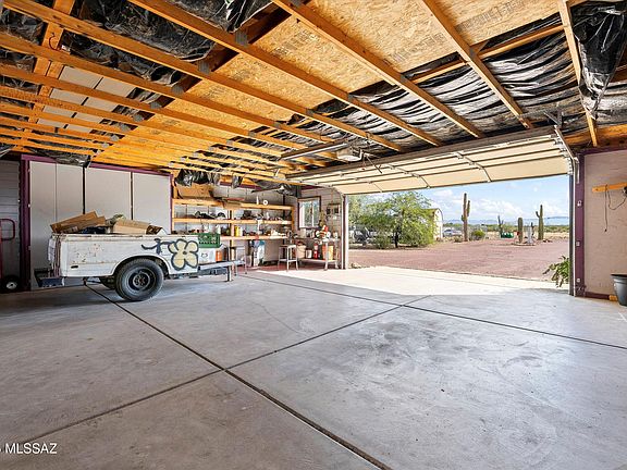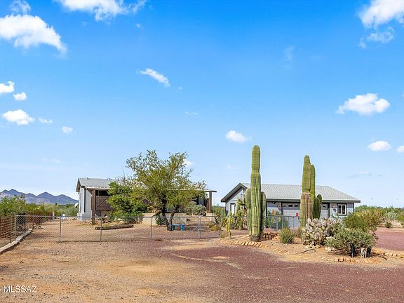 Welcome to your private desert retreat! This charming 3-bedroom, 2-bath home sits on 2.61 acres with no HOA, offering room to spread out & enjoy the peace and beauty of rural living. The property features fenced front & back yards, perfect for pets, gardens, or gatherings beneath Arizona's wide-open skies.Take in uninterrupted sunset & mountain views from the fenced backyard. Enjoy a morning coffee under the covered front porch, complete with tumbled brick patio, stairs, & a convenient ramp leading to the yard & garage.A true highlight of this property is the detached 3-car garage w/a workshopa"ideal for hobbies, storage, or a home business. Equipped with solar panels to help lower energy costs. This property allows for room to roam, extra workspace, or a peaceful place to call home