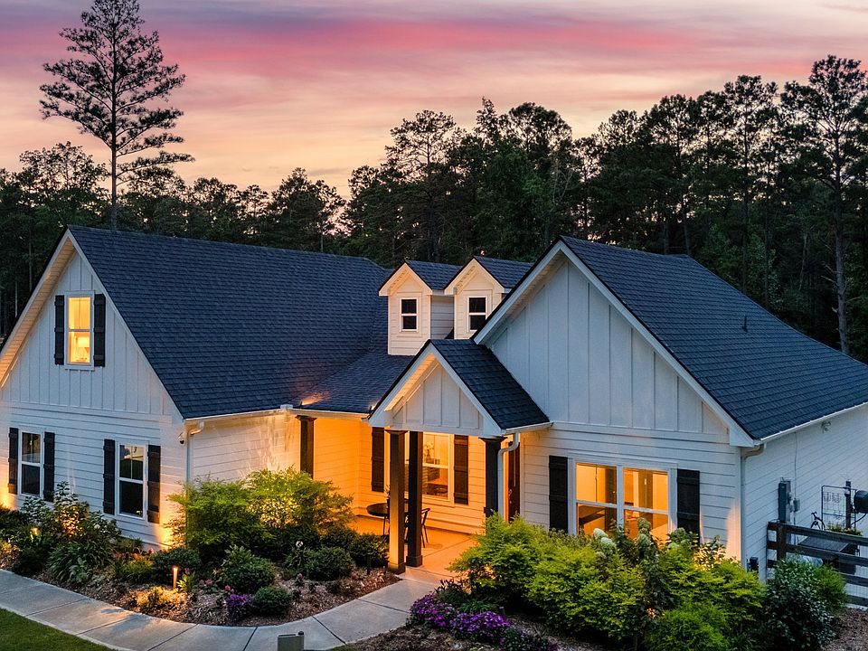 Welcome to this modern farmhouse set on a gorgeously landscaped 5-acre lot, offering the perfect balance of timeless design and contemporary comfort. From the moment you arrive at the gated entry, the picturesque setting and expansive grounds create a true sense of retreat, while still providing all the conveniences of modern living. Inside, the home showcases an open floor plan with clean lines, elegant finishes, and abundant natural light. Spacious living areas flow seamlessly, highlighted by a gourmet kitchen designed for both everyday living and entertaining. Just off the family room, a keeping room with a striking stone fireplace provides a warm and inviting space for relaxation or casual gatherings. A large dining area completes the home's versatile layout. The main level features three bedrooms, including the primary suite, offering ease of one-level living. Upstairs, you'll find a large fourth bedroom and a full bath-perfect for guests, a teen suite, or private office space. Step outside and experience one of the property's most remarkable features-an expansive concrete patio that spans the entire length of the home. One covered area is designed for outdoor TV viewing and lounging, while another provides the perfect setting for al fresco covered dining. Ideal for entertaining, family gatherings, or enjoying quiet mornings and breathtaking sunset evening views, this outdoor space connects seamlessly to the landscaped grounds and natural beauty that surround the property. The front and back yards are fully fenced, offering both privacy and functionality, perfect for pets, play, or gardening. With five acres of lush land, there's plenty of room to garden, explore, or simply enjoy the space and serenity. Beyond the open lawns and gardens, two wooded acres provide natural trails for exploring and enjoying the outdoors, adding to the retreat-like atmosphere.This exceptional property combines modern farmhouse style with thoughtful outdoor living, creating a home that is as functional as it is impressive.
