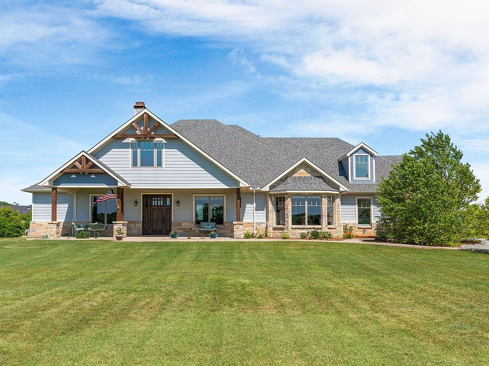 Stunning Custom Built craftsman Estate built in 2018 with Breathtaking Views and a Versatile barndominium with workshop! Welcome to your dream property, with two homes on the 2.5 acres. Whether you are looking for guest accommodations, multi generational living, or an income producing opportunity, this second structure offers endless potential. The main residence is a 1.5 story home with 3 bedrooms down and one bedroom up with full bath. The barndo is a residence all of its own with 3 bedrooms and 3 bathrooms. This meticulously craftsman style home offers the perfect blend of luxury, functionality all set against panoramic sunrise and sunset views with an expansive front porch and in back, an outdoor living area with kitchen and stone fireplace. The main residence is an energy efficient 4 bedroom, 4 bath masterpiece, thoughtfully constructed with spray foam insulation and low E windows to ensure year round comfort and savings. The interior has custom finishes throughout, from warm woodwork including beams, custom mantle, extensive millwork throughout the home to designer lighting. The heart of the home is a chef's dream kitchen, equipped with a gas range, double ovens, convection microwave, commercial ice maker in bar, & built in coffee maker in a spacious chef's pantry with a serving bar. The island is large with storage. Handsome soapstone countertops in kitchen match the surround to the fireplace. The primary bath is ultra luxurious with a copper nickel freestanding soaking tub, custom cabinetry, granite counter tops, lovely walk in shower with 3 body sprays. Adding tremendous value and versatility, the property also includes a separate 1400 square foot barndo 1400 square ft. workshop. Don't miss your chance to own this one of a kind estate that perfectly balances elegance, comfort and practicality. Immaculate! See supplements for list of features for main residence and barndo. This home also has a chicken coup & raised container gardens along with fruit trees. 2025-06-22