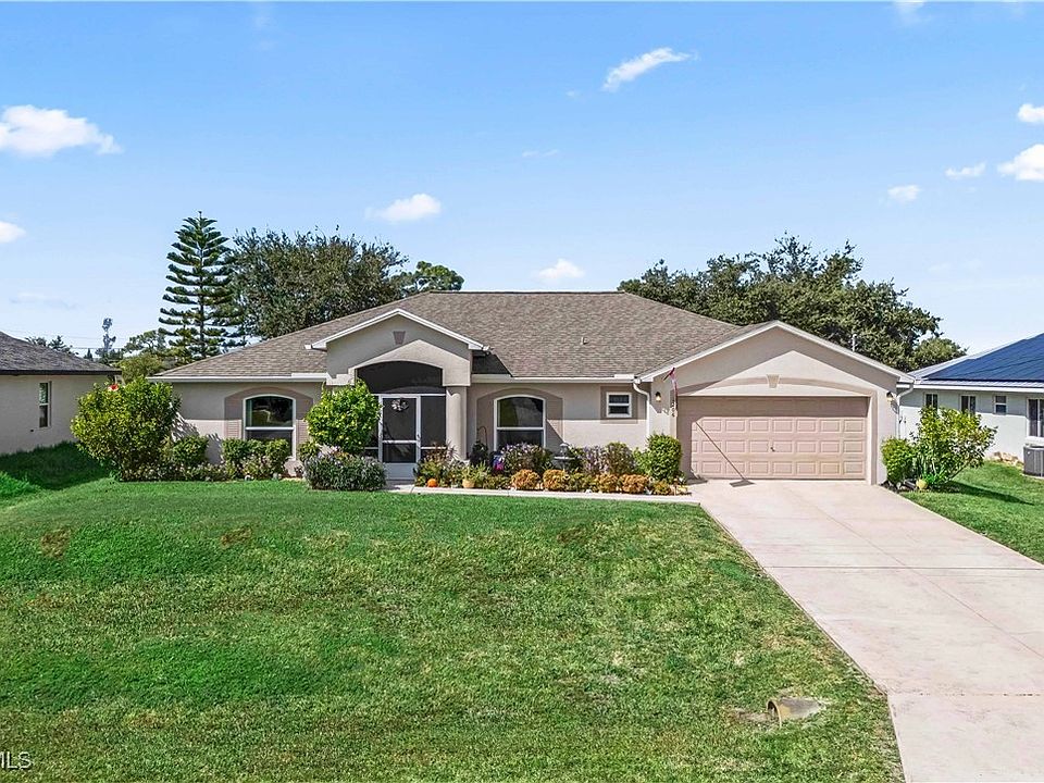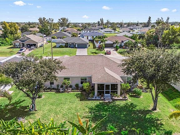 Great 3/2/2 home in NW Cape Coral and Not in a Flood Zone! Enter through the screened front porch area to the open floor plan. Home features a formal dining room, living room, great room plus eatin kitchen. The primary bedroom has a walk in closet and the bath has double sinks and separate soaking tub and shower. Updates include Hurricane windows (2020), New roof (2022) washer/dryer 1 year old, upgraded kitchen counters, and gutters. Very nicely landscaped in the front and the back. Sit out back in your screened lanai and enjoy all the greenery. Plenty of room for a pool! Close to Coral Oaks Colf course, a new linear trail and the Pine Island Corridor that has plenty of shopping and restaurants. Call today to schedule your showing.