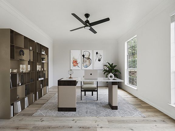 Sparkling pool and spaModern fixturesStriking fireplaceContemporary lightingTall privacy fenceFresh paintIn home office