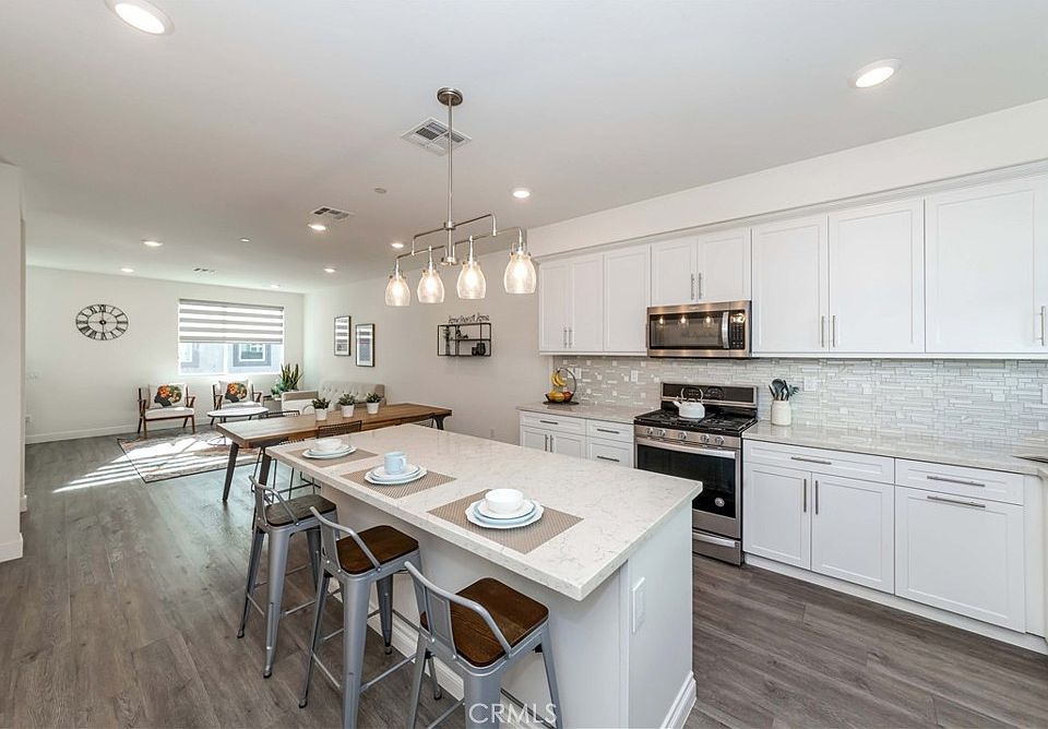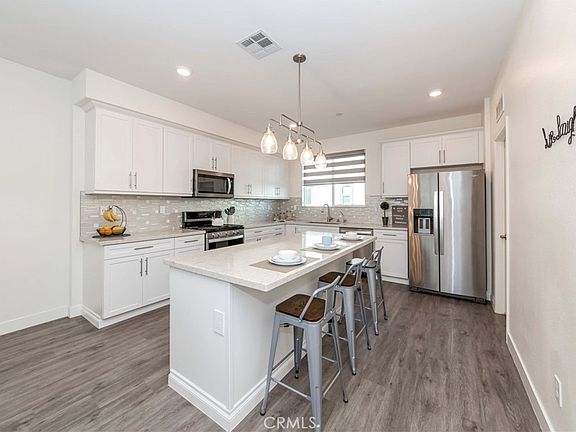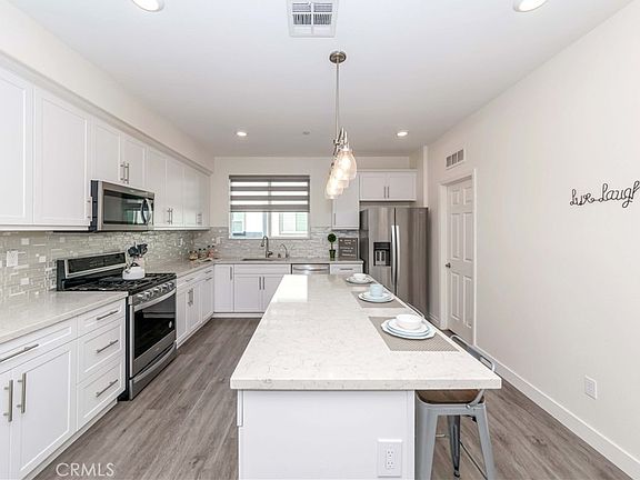 Exquisite Home at "The Cottages At Harbor Pointe”. Discover the epitome of refined living in this meticulously designed residence. This luxurious home seamlessly combines a designer-perfect, bright-open floor plan with elegant high-end finishes throughout. The first floor welcomes you with a 2-car garage and a tranquil room ideal for use as an office or yoga space. Ascend to the second floor, where a bright living room opens to a dining space and kitchen. The kitchen is adorned with stainless steel appliances, a walk-in pantry, a generously sized island, and upgraded quartz countertops with a stylish backsplash. The third floor is dedicated to comfort, featuring a master suite with a spacious walk-in closet and a bathroom boasting a quartz countertop vanity and walk-in shower. Two additional bedrooms and a full bathroom complete this level. Conveniently located on the same floor is a washer/dryer in a closet, offering an ideal laundry solution for the bedrooms. Luxury waterproof flooring graces the entire home, creating an ambiance of sophistication. Energy efficiency is seamlessly integrated with features such as a tankless water heater, dual climate control programmable thermostat, LED lighting, and Energy Star certified appliances. Additional amenities include recessed lighting, a newer A/C unit, window coverings, and left over KB Home 7 Year Limited Warranty. Enjoy the large green area and kids' playground, along with outdoor seating areas and BBQ grills for delightful picnics. This home is strategically located with easy access to freeways, recreational areas, schools, and shops. Experience the perfect blend of comfort and convenience.