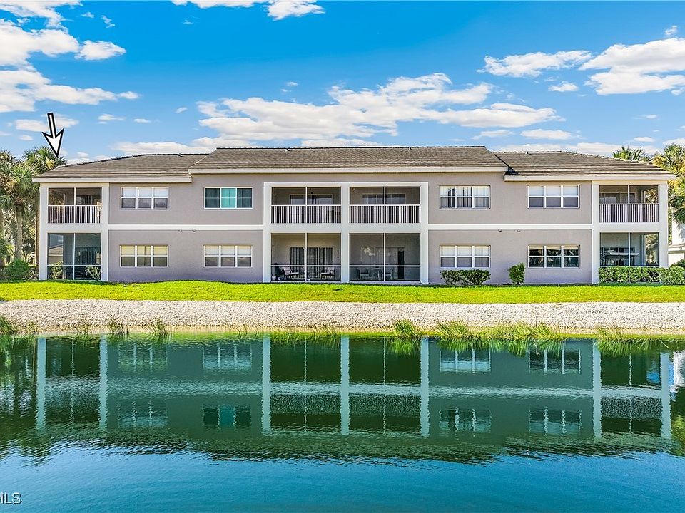 Lake-view, turnkey condo with so many perks and amenities and a great location!! This condo has everything you need to enjoy sunny Florida at any time of the year, beautifully furnished. This furnished condo has a queen bedroom set in the master and twin beds in the guest room. Enjoy the community pool & hot tub, dog park, golf course, putting green, tennis court, bike/jog path, BBQ, basketball, a playground, and clubhouse. And all of this close to I-75, the airport, baseball stadiums, restaurants, neighborhood grocery stores, drug stores, schools, Hertz Arena and much more! Gulf Coast Town Center and Miramar Shops are a short drive with the Daniels Road corridor making travel very convenient. The buildings are freshly painted and have new roofs. HOA fees cover water, WIFI, security, some amenities, insurance. Memberships are available for the 18-hole golf course and social membership options to the Gateway Golf & Country Club, putting green, instructional facility, clubhouse with fine and dining, fitness center, bocce courts, resort-style pool and more. No flood insurance required here and no storm damage in unit. Just come and enjoy Florida maintenance-free living and have your morning coffee and evening beverage on your furnished lanai overlooking your lake view. There is an assigned parking spot and guest spots conveniently next to this building. For income, this condo can be used as a rental property immediately.
