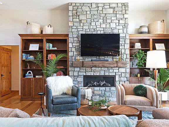The main level features a large primary suite with an ensuite bathroom and a generous walk-in closet, offering a private and peaceful retreat. Two additional bedrooms on this floor provide flexible space for guests, family, or a home office. The expansive living room is warm and welcoming, highlighted by a tall ceiling, custom-built-in book/display cases flanking the floor-to-ceiling natural stone fireplace, and striking features that add architectural character. It’s an ideal space for both relaxed living and elegant entertaining. The kitchen is a true chef’s delight, boasting stone countertops, custom cabinetry with thoughtful storage solutions, a handcrafted range hood, high-end GE Cafe; refrigerator, double oven with convection, and a large island perfect for meal preparation and casual gatherings. A stylish kitchen bar offers additional seating, ideal for morning coffee or informal dining. The lower level enhances the versatility of the home with an additional private suite, a spacious family room perfect for movie nights or gatherings, and a workout/flex room to meet your lifestyle needs.