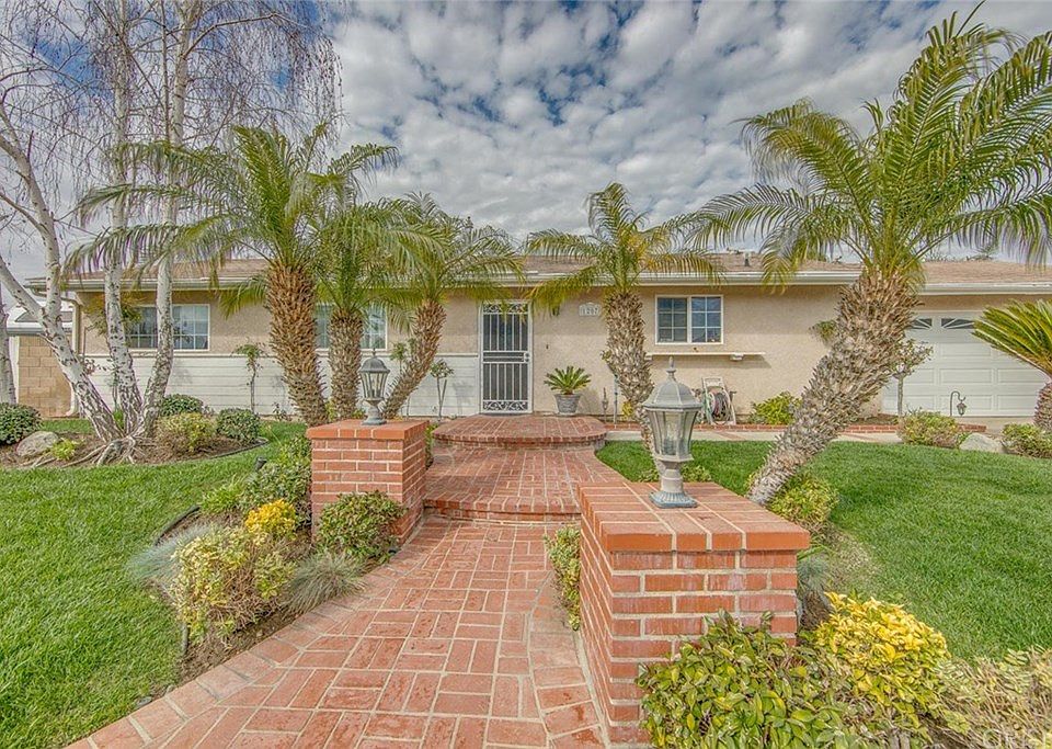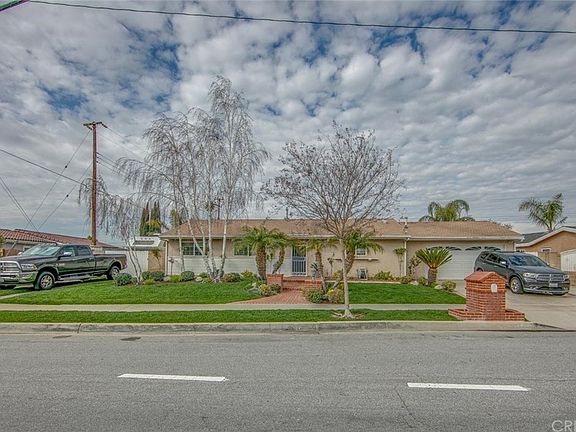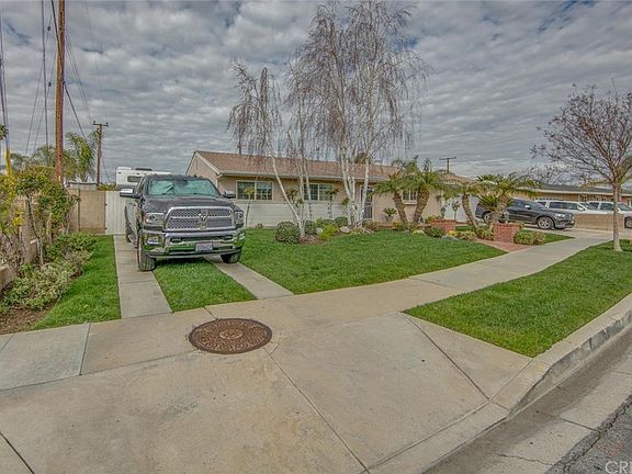 Bright and open describes this 4 bedroom home. The front yard is beautifully landscaped with brick walkways, planters and shrubbery. The updated kitchen has tile flooring, granite counter-tops and tile back-splashes, stainless steel dishwasher, microwave and oven/range. Kitchen is built with custom cabinetry with clever storage places, soft close cupboard doors, recessed lighting and a cute dining area with customized dining set included. The living room has wood laminate flooring, with dual pane sliding doors leading to the huge backyard. Nice 1/2 bath off the kitchen area and the rear bedroom. The master bedroom is attached to the full bathroom which also opens to the hallway. All bedrooms have ceiling fans, three with newer carpeting, one with wood laminate. Newer dual pane windows throughout, smooth ceilings and some crown moulding. There is RV parking in front and in back as well as an attached two car garage. The back yard has a beautiful swimming pool with lots of room for a lawn, or a huge garden, as mentioned, a large RV, or use your imagination. A tool shed is included.