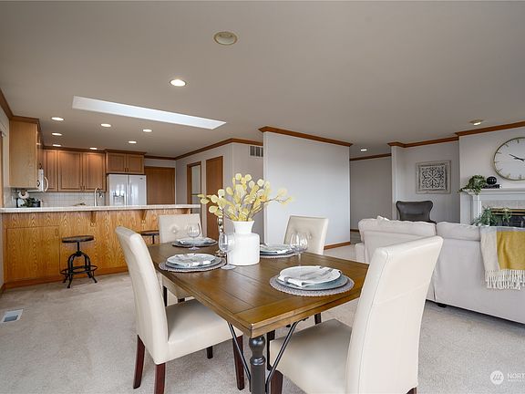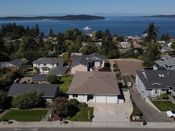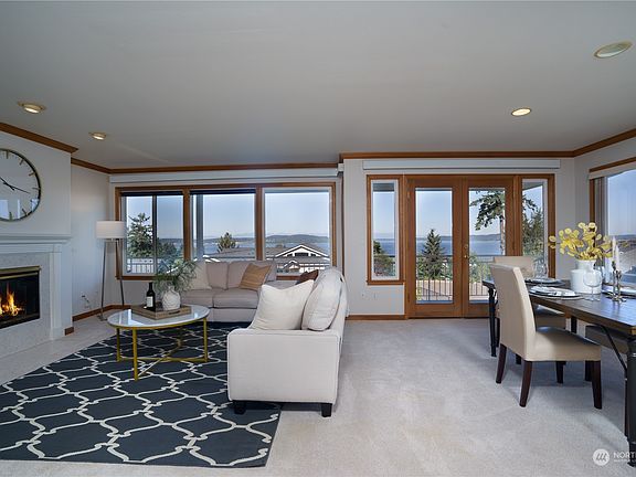 Come home to spectacular sunsets with western view exposure! With its warm natural lighting and skylights, the view follows you almost everywhere inside. Located in the historic Town of Steilacoom (Washington State's oldest town!), you will enjoy the small town feel - but with convenient access to jobs, and to destinations like Chambers Bay and Mount Rainier. This home has serious ADU/mother-in-law unit potential, with its two kitchens *and* two laundry rooms! Turnkey condition, with brand new flooring, a spacious open concept floor plan, and a well-kept yard that sees the water as well. The main floor primary suite enjoys its own private fireplace, so you can stay warm in the cooler months while looking out at the water. Come check it out!