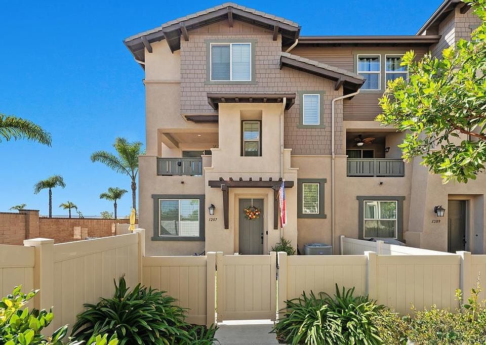 Built in 2021, this near new tri-level home offers 1,824 square feet of beautifully designed living space with four bedrooms and three and a half baths. Located on a desirable corner lot with consistent breezes in the near-new community of Pacific Ridge, this residence combines contemporary style with functional comfort, perfect for families or anyone looking for a spacious, low-maintenance home near everything Oceanside has to offer.  The first level features a full bedroom and bathroom, creating a private retreat ideal for guests, extended family, or a home office. The two-car garage offers plenty of storage and convenient access to the entryway.  Upstairs, the main living area is open, bright, and inviting. Tall ceilings and recessed lighting enhance the sense of space, while large windows covered with timeless plantation shutters fill the rooms with an abundance of natural light. The kitchen is a showstopper, with sleek quartz countertops, stainless steel appliances, white cabinetry, decorative pendant lighting above your eat-in kitchen island and durable tile plank flooring that flows seamlessly into the dining and living areas. A spacious balcony off the living room provides the perfect spot for morning coffee or relaxing evenings, and the half bath and laundry room add everyday convenience.  On the third floor, you’ll find two secondary bedrooms connected by a stylish Jack-and-Jill bathroom, along with the luxurious primary suite. The primary bedroom includes a large walk-in closet and a spa-like ensuite bath featuring dual vanities, a soaking tub, and a separate shower. Throughout the home, you’ll appreciate the thoughtful details like new carpet, fresh paint, ceiling fans, and the overall feeling of warmth and modern comfort.  As a corner unit, this property enjoys an expansive front and side yard with artificial turf for easy maintenance and plenty of space for outdoor play. A concrete patio provides an inviting area for dining and entertaining. With its combination of newer construction, flexible layout, and outdoor living options, this home feels like a single-family residence with all the benefits of a modern community setting.  Ideally located close to schools, shops, restaurants, and beaches, 1207 Via Lucero offers the best of Oceanside living in a quiet, friendly neighborhood. Residents of Pacific Ridge also enjoy resort-style community amenities including a lap pool, relaxing spa, tot lot, BBQ area, and a dedicated pet area, creating the perfect blend of comfort, convenience, and coastal lifestyle.