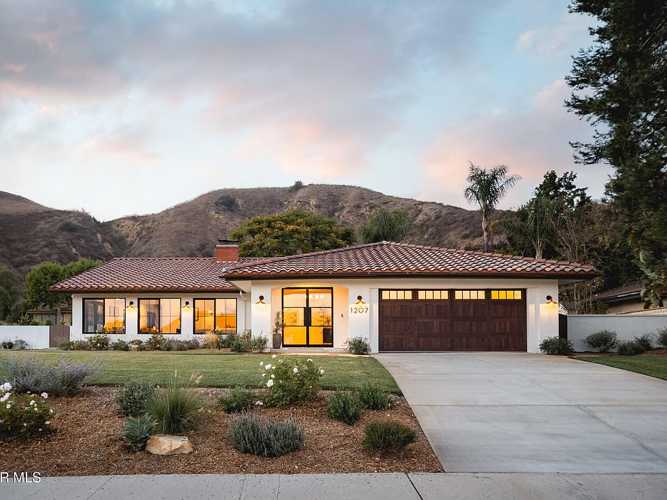 Spanish-Inspired Stunner with Ocean Views & Designer Finishes. Discover this stunning Spanish-style single-story showplace in Ventura's coveted Clearpoint community. Perched on a premium corner lot at the top of a cul-de-sac, this fully remodeled 3-bed, 3.5-bath home pairs ocean, mountain, and sunset views with high-end, designer-level finishes throughout. Step through a custom Pinky's Iron double-door entry into airy interiors featuring wide-plank French oak floors, vaulted ceilings, and walls of glass for seamless indoor-outdoor living. The open-concept layout flows from a fireplace-lit living room to a formal dining area and cozy family room. At the heart of this home is a gourmet kitchen with Arabescato Corchia marble counters, flanked by unlaquered brass faucets, hardware and ocean views. Here you will find full custom cabinetry with a rich green tone that blends the warm hues of brass and French oak beautifully. New appliances throughout are waiting for your arrival French doors off the breakfast nook open to a beautifully landscaped backyard retreat. The spacious primary suite offers direct access to the outdoors and a spa-like bath with Zellige tile, a soaking tub, a custom iron shower enclosure, and a walk-in closet. Two additional bedrooms and stylish bathrooms, including a powder room, provide comfort and privacy. The expansive backyard is built for entertaining, with dining area, lounge area, new grass and sprinkler systems, flagstone paths, fruit trees, views, and room for a future pool or ADU. Additional upgrades include: windows/doors, HVAC, electrical, plumbing, water heater, washer/dryer, new roof, epoxy-finished garage, designer lighting, new stucco, and more. This home blends luxury, style, and the best of California living—schedule your private tour today!