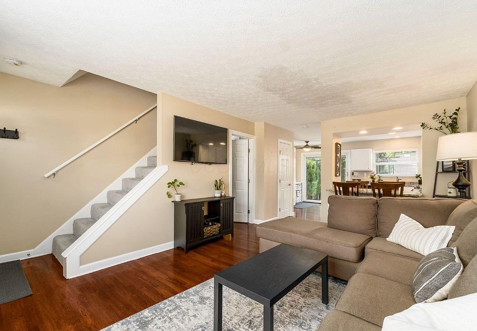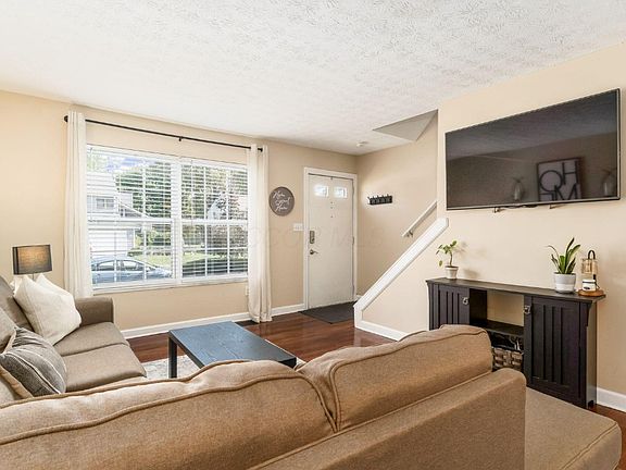 Beautiful 2-story condo featuring an egress window and stunning dark hardwood floors throughout the first floor. The open-concept layout includes a bright living room and a well-appointed kitchen with an eating area, breakfast bar, granite countertops, built-in pantry, quality cabinetry, and stainless steel appliances.