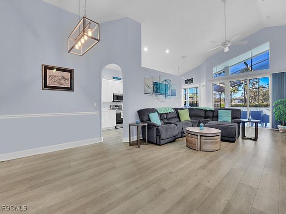 Elegant semi-custom 3-bedroom + den/office, 2-bath home overlooking the the first tee box of the award-winning Tom Fazio–designed golf course at The Club at Gateway with rear water view. This beautifully maintained residence features a roof replacement in 2024, cathedral ceilings, LVP flooring throughout, and a newly refreshed kitchen with quartz countertops, modern sink, and stainless steel appliances (2024). Enjoy renovated baths, a versatile den/office, and seamless indoor-outdoor living with a screened lanai, privacy screens (2024), and private pool with new filtration system (2024) and pump (2025). Additional upgrades include a hurricane-rated garage door (2024) and HVAC (2021). NO FLOOD INSURANCE required. Live the luxury golf lifestyle in one of Southwest Florida’s premier gated communities.