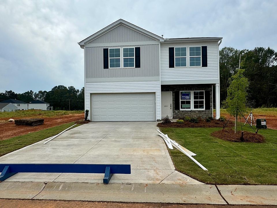 This beautiful two-story home boasts three bedrooms, two-and-one-half bathrooms, flex room, open kitchen, eat-in, and family room, and a loft on the second level. The flex room is located upon entering the home, and a long foyer will lead you to the kitchen, complete with upgraded cabinets, granite countertops, luxury vinyl plank flooring, and an island with bar top seating. This space opens to an eating area and a great room. All three bedrooms and the loft are located on the second floor, with a spacious guest bath conveniently located near the spare bedrooms and a laundry room with cabinets in lieu of wire shelving. The primary suite features a large 10x11 walk-in closet and a bathroom with dual vanities and a walk in shower with glass doors. A uncovered porch has been added just off of the eat-in area, and the yard is fully sodded with grow easy landscaping.