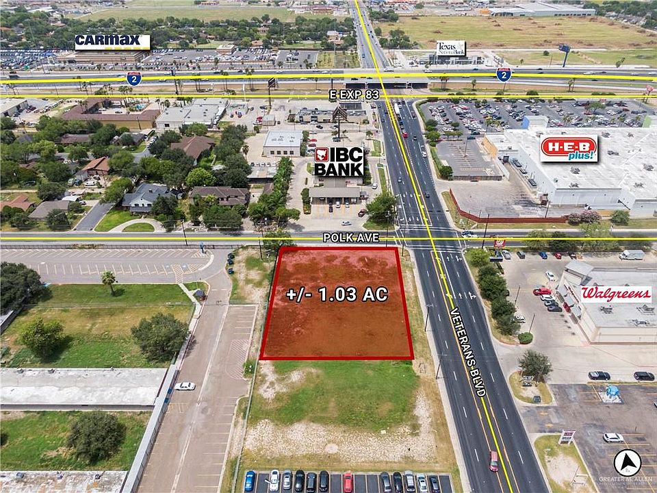 1.03 Gross, .77 net acre lot on E Polk Ave and N Veterans Blvd. Great location for retail plaza or any type of business with easy access to I-2. Adjacent to International Bank of Commerce and Training Facility, NAFT Federal Credit Union, Sonia M. Sotomayor High School and Walgreens. Across the street from HEB Plus.