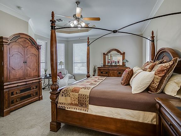 Truly the jewel of the neighborhood on a one of a kind interior elbow lot! No neighbors behind you, or to the left, just steps from the walking trail make for a parklike setting for all to enjoy. There is a space for everyone in this beautiful home! A very grand two story entry, opens to the main living area and kitchen welcomed by a wall of windows to the back patio. Master bedroom suite, down in the rear with access to the outdoor living space, complete with built in grill, gas fireplace and TV area. The upstairs has 4 bedrooms, office loft, media room, and more walk out storage than you can imagine. A unique extra deep 3 car garage that will accomodate Texas size vehicles, plus room to work! Better come now!