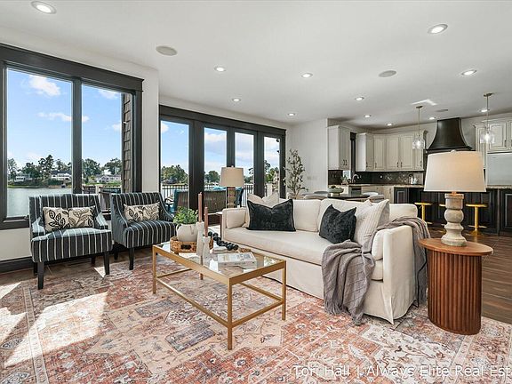 The main level is anchored by a gourmet kitchen designed for both function and beauty, featuring dual refrigerators, granite countertops, a lavish island with built-in wine storage, and a walk-in pantry. The open-concept layout seamlessly flows into a spacious living room, adorned with custom-built-ins, a gas fireplace, and direct access to the lakeside terrace, perfect for entertaining. Upstairs, the expansive primary suite is a true sanctuary, with a multi-faceted vaulted ceiling, sitting lounge, and panoramic lake views. Two walk-in closets lead to a spa-inspired en suite featuring a curved entry wall, granite vanity, and a stunning custom tile shower with dual heads. Two additional generously proportioned bedrooms, a full bath, and a dedicated laundry room complete the upper level.