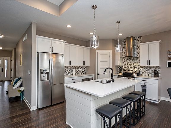 Enjoy the view from the covered deck of this modern, 5BR ranch backing to a city park! This home checks all the boxes; hardwood flooring, walk-in pantry, laundry attached to primary suite and mudroom, and finished walkout lower level with a wet bar! Light and bright with natural light, the living area is open with a gas fireplace and windows on each side. The dining area leads to a covered deck, and the kitchen boasts white cabinets, tile backsplash, shiplap island with quartz countertops and SS appliances. Primary bedroom is spacious with a tray ceiling, plus a bath with dual vanity, tile shower and walk-in closet. 2 additional bedrooms and a full bath are included in the main level. Downstairs you'll find a roomy living area with wet bar. Sliders lead to a large concrete patio overlooking the fenced backyard. 2 more bedrooms and a full bath are located in the lower level, and through the unfinished storage area you'll find a hidden gym space! Plenty of room for your bike and tread - and out of sight. The 3 car attached garage is oversized at over 700 sf. The home is plumbed for irrigation. New roof and gutters in 2021~ don't miss this rare property with no backyard neighbors!