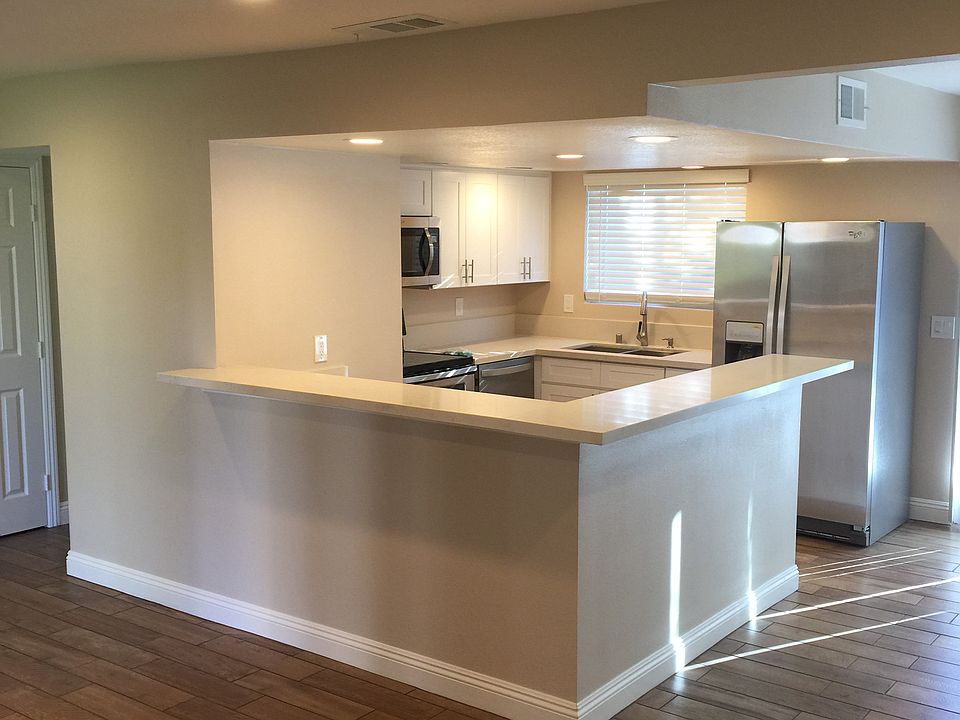 This two-story, 3 bedroom, 2 1/2 bath, condominium has a beautiful kitchen with quartz countertops, range with microwave, refrigerator, dishwasher, wood-look tile and carpeted floors, new paint, blinds, washer & dryer, two private carport parking spaces, and a block wall patio.