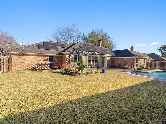 A rare find in the heart of South Tyler, this thoughtfully updated home delivers what most pool properties cannot: space, privacy, and a true backyard to enjoy. Framed by mature trees and vaulted ceilings, this residence commands attention from the moment you arrive. Designed for both everyday living and unforgettable entertaining, the backyard takes the spotlight featuring a sparkling pool and an expansive adjacent yard, offering room to play, garden, host, or simply unwind. This is outdoor living without compromise. Inside, the home showcases a well-executed floor plan with generously sized living areas and bedrooms, all flowing effortlessly from one space to the next. The kitchen is partially open to the main living area, anchored by a sunny breakfast room and breakfast bar. The primary suite is a private retreat overlooking the pool, complete with a beautifully updated bath featuring double vanities, a striking custom walk-in tile shower, and separate walk-in closets. A large family room with a gas fireplace adds warmth and character, while a walk-in laundry room enhances functionality. Beautifully updated, intentionally designed, and exceptionally located—this home stands apart by offering what buyers want most and what the market rarely provides. Also this home has a whole home generator and solar panels. Make this one yours today!