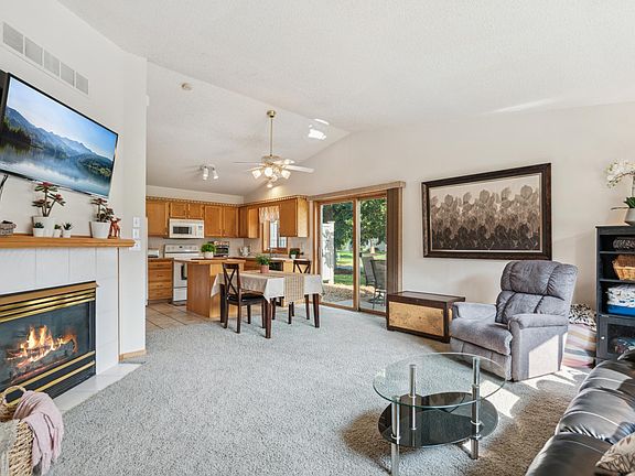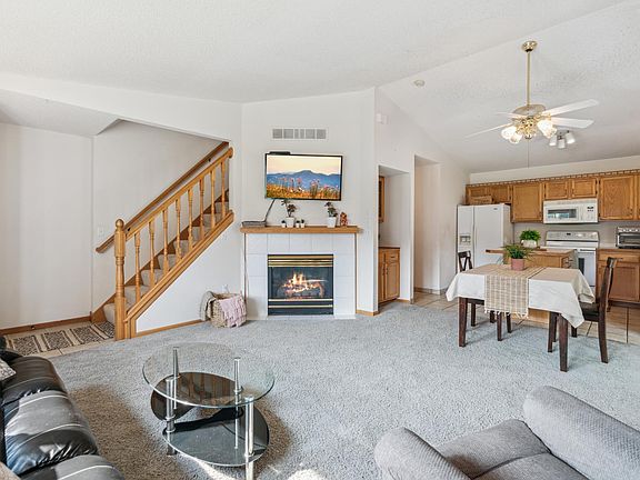 Located on a cul-de-sac with views of a beautiful pond, this move-in-ready, end-unit townhome has been well maintained. Southwest facing allows for tons of natural light. Open concept main living area boasts vaulted ceilings, beautiful gas fireplace and walkout to patio. Kitchen features a center island along with a built-in buffet. Also located on the main level is a 1/2 bath. Laundry room is conveniently located on second floor, along with full bathroom, two bedrooms, with a large walk-in closet in the primary bedroom. Community has a shared playground/park/sport court. New furnace and new storm door in 2024.