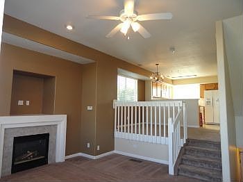 Great 3 bed town home, end unit with a view of the mountains, fireplace in living room,ceiling fan,kitchen includes stove/oven,refrigerator, dishwasher,microwave,eating space off the kitchen,washer and dryer included, window coverings,extra large walk in storage area, 1 car attached garage, patio area, community pool,walking distance to new library and school.