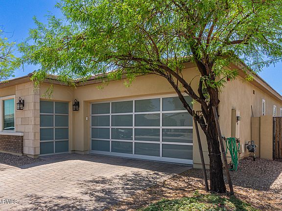 The search is finally over! This lovely 3-bedroom residence welcomes you with a 2-car + golf cart garage, a tasteful paver driveway, and charming brick accents. You'll be delighted by the captivating open layout with high ceilings, an earth-tone palette, blinds, and attractive wood-look flooring. The stunning kitchen boasts granite counters, a striking tile backsplash, chic pendant lighting, white shaker cabinets with crown moulding, SS appliances, a pantry, and a large island with a breakfast bar. The primary suite showcases plantation shutters, soft carpeting, an ensuite with dual sinks, and a walk-in closet. Unwind in the backyard, which includes a covered patio, travertine pavers, low-maintenance artificial turf, and a fire pit for evenings under the stars. Make this gem yours today!