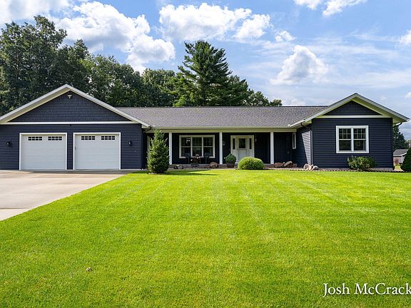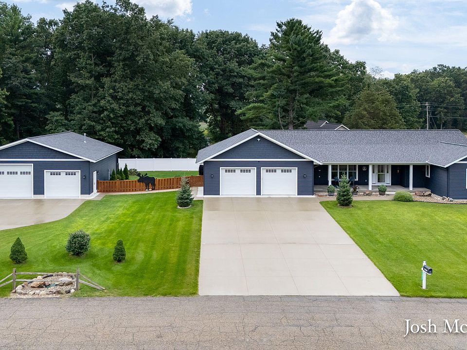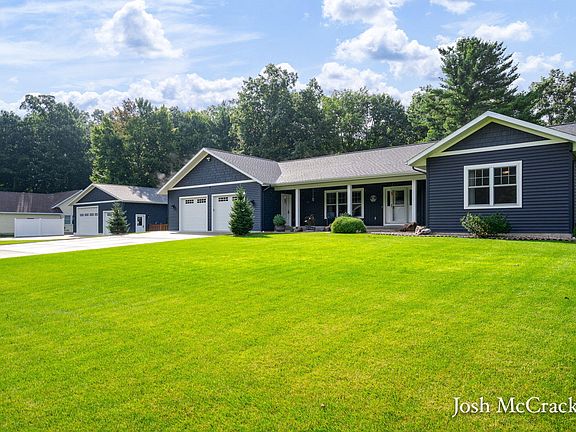 Custom-built in 2019, this 4-bed, 3.5-bath ranch offers 3,494 finished sq ft and the lifestyle you've been waiting for just minutes from Gun Lake. The main level features an open kitchen with custom hickory cabinets, a sun room, and a living area that flows to a private covered patio. The primary suite and main-floor laundry keep convenience at the forefront, while every bedroom closet includes custom organizers.