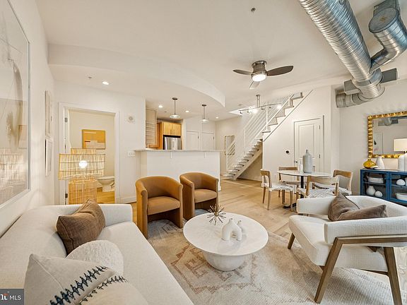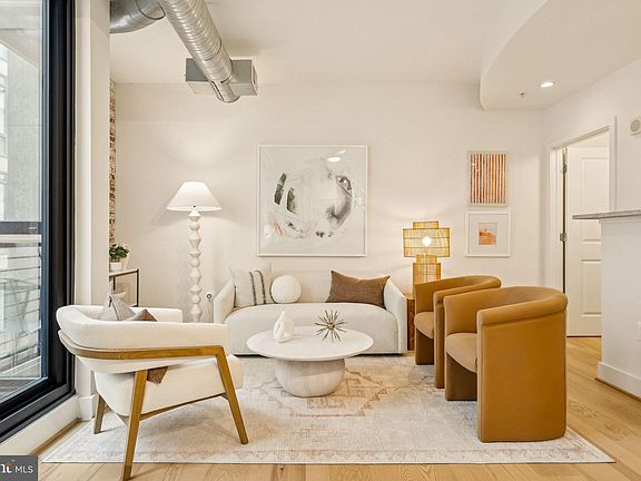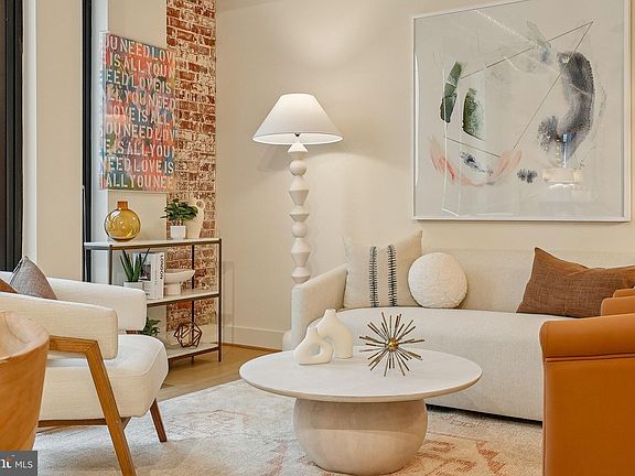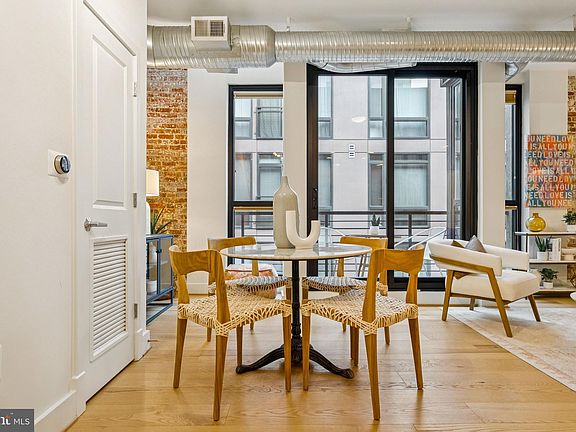 This fabulous two-level loft impresses with floor-to-ceiling windows, walls of exposed brick, and soaring ceilings showcasing multiple skylights. Its first floor features a spacious living-dining room with wide plank oak floors, a balcony, and powder room. The kitchen is equipped with modern flat front cabinets, granite countertops, and stainless steel appliances including a gas range and new refrigerator. The upper floor has an open-area den (perfect for a home office), a bedroom large enough to accommodate a king size bed, and a dual entry bathroom with a dual sink vanity and walk-in shower. Washer and dryer are conveniently located on this floor. Fennessy Lofts is a boutique elevator building with an unbeatable Logan Circle location and offers a communal rooftop and bike storage. Pet friendly. Additional storage unit conveys (#25).
