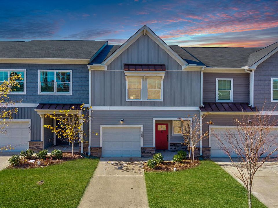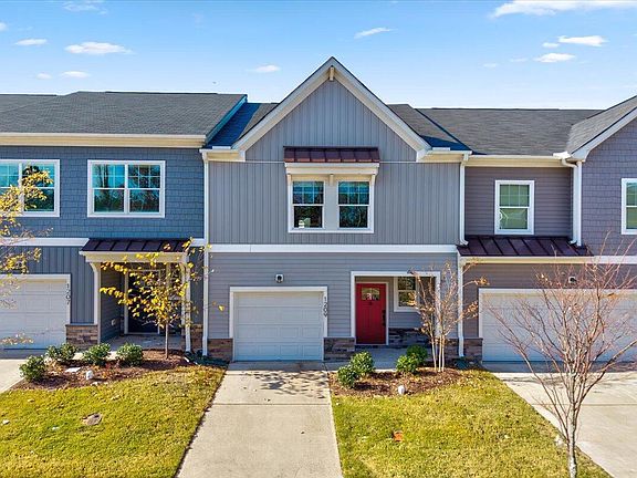 Beautiful East-Facing townhome with a 1-car garage ideally located across from the community walking trail entrance. This light-filled home offers 3 bedrooms and 2.5 baths with a bright, open layout that blends comfort and modern style. The chef's kitchen features granite countertops, stainless steel appliances, gas range with vented hood, separate coffee bar, and ample cabinetry, along with a small drop zone at the entry for added convenience. Both levels feature 9-foot ceilings, complemented by wood treads on the stairs, LVP flooring in the loft, and carpeted bedrooms. The spacious primary suite sits privately at the rear and showcases a tiled shower, double vanities, granite counters, large walk-in closet, and separate water closet. The shared hall bath also includes dual sinks and Moen fixtures, with granite in all baths. Enjoy natural privacy from the wooded terrain behind the home. Ideally located just 2 minutes from the incredible Park West Village shopping, with easy access to NC-540 and N Hwy 55, fiber internet ready, and surrounded by some of the best schools in the area, plus community dog park and paved trails—a perfect blend of modern comfort, thoughtful design, and unbeatable location.
