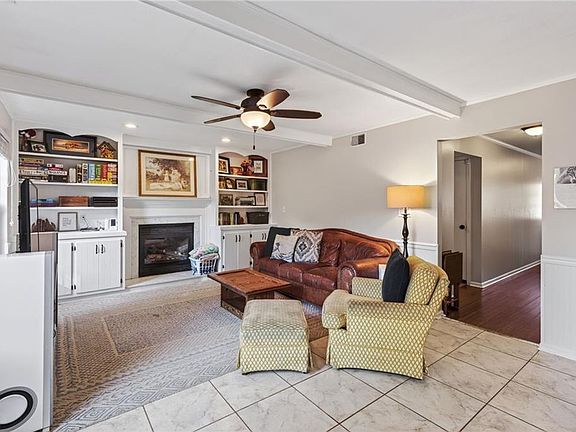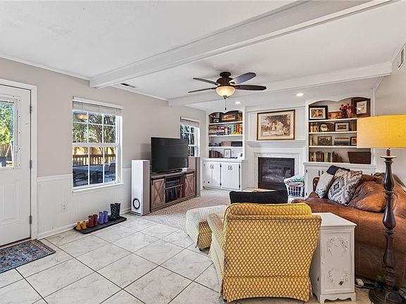 Dining room with moldingsFenced backyardBright open kitchenGas rangeBuilt in bookshelvesWood flooringLarge primary bedroom