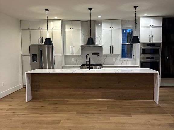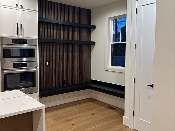The reception area features an acoustic teak wall and ebony mantle leading to the front living room with 60-inch linear gas fireplace. Requisite rustic oak engineered flooring underfoot and breathtaking spaces; massive front windows, and an ample open concept space that accommodates both recreation and space for formal dining. The modern kitchen features fixtures befit a gourmet chef. Stainless Bosch appliances with a slide in 36- inch six burner range with accessible pot filler, ample storage in stacked ceiling height modern shaker cabinetry, and seating for 8 at the twelve-foot waterfall quartz stone island and a deep farmer's sink. A wall oven and convection microwave complete the appliance package. Adjacent to the kitchen is a built in Banquet with matching acoustic teak walls and space for a breakfast nook or extra party seating. A coat closet and rear door lead provide access to the deck; and a wall of Fold away nano doors open to the oversized Trex deck with custom metal railings and stairs to the rear yard.