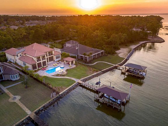 Located just 7 minutes north of Sandestin and Grand Blvd yet worlds away rests a stunning custom estate situated on 101 ft of Choctawhatchee Bay. This 2016-built, ICF constructed, 6,478 sqft, geothermal heated/cooled, transitionally designed architectural beauty is unequaled in craftsmanship and design. This home blends perfectly with its wooded surroundings, strategically revealing the magnificence of the natural landscape. A spectacular, visually-stirring bayfront oasis features a full-size, heated, saltwater pool; elevated spa; lounging areas; fire pit; cabana with shower; and screened-in lanai with fireplace and well-appointed summer kitchen. The large dock includes a swim platform; two jet ski lifts; and a covered and lighted boatlift that accommodates a 6,000 lb boat. All outdoor spaces including the dock have access to Wi-Fi and the full-home audio system. ICF construction and aging-in-place features ensure this home will last for a lifetime and many generations to come. Inside, traditional finishes mixed with modern materials create a classic, timeless design. Notable design details include custom millwork and trim; satin finished Nickel lever door and window handles; custom travertine floors and engineered hardwoods; solid doors; crystal chandeliers, electric-controlled shades, beautiful wood columns; full-size elevator; custom ceiling fans; and 12 and 10 ft ceilings. The custom chef's kitchen is a showpiece with quartz counter tops, two islands with sinks, bar seating area, soft black cabinets, paneled appliances, and hand-painted, Italian backsplash. Premium appliances include a Wolf 6-burner gas range with two ovens, Sub-Zero refrigerator, warming drawer and Bosch dishwasher. The wet bar features a bar-size refrigerator, wine refrigerator, ice machine, sink, wine rack, and storage. This home provides 4 dining areas for entertaining: a formal dining room, a Bayfront keeping area with seating for 10, an outdoor dining area, and a large breakfast bar. Located on the main floor, the master suite presents sweeping Bay views and immediate access to the poolside lanai. Featuring a luxurious soaking tub with jets, walk-in shower with slate finished walls and multiple showerheads, two custom-designed closets, and designer finishes, the master en suite is a spa-like retreat. The second floor boasts 4 bedrooms, a study, family room with wet bar, and a large lanai. The 3-bay garage features built-in storage, custom flooring, heated/cooled workshop, and a deep sink. Additionally, this Frank Janssen built home features a covered gutter system with extended drain lines, concrete tile roof with waterproof membrane, 10 ft elevation above the Bay, 18K Generac gas generator, pool alarm system, Rainbird sprinkler system, LED lighting, 4 interior geothermal units plus additional units for pool and workshop, sound proof interior walls, security system, home audio, and much more.