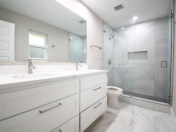 Terrific home just underwent complete interior renovation with removal of walls to open floor-plan. Eat-at island kitchen with stainless steel appliances including fridge, quartz counter-tops in kitchen & all 3 baths. Tons of natural light, walk-in utility & pantry. All baths offer beautiful glassed showers, one with double sinks. 2 bedrooms offer en-suite baths. High quality wood-simulated flooring with porcelain tile in wet areas. Interior is new. No one has lived in or on finishes.