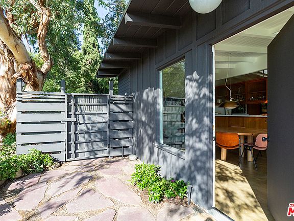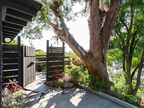 Dreamy Mid Century with sunset views in the hills of Highland Park. Hidden from the street and utterly private, you'll discover an expansive front deck, positioned perfectly to capture the canyon views and designed with elements of relaxation and gatherings alike. Built in 1958, the floor plan is open and flexible with floor to ceiling windows and exposed beams in the open and airy living room. The dining room is accentuated by a limestone fireplace set in the corner for cozy winter meals with friends. The gracious kitchen has warm wood cabinets and loads storage. The master bedroom features perfectly placed bedside lighting, large corner windows and custom built-ins. A full bath and 2nd bedroom complete the home. A flat side yard with faux grass doubles as a play space and built-in grill with outdoor kitchen prep area make entertaining a breeze. Enjoy epic sunsets with friends in one of the hippest neighborhoods in NELA - this is true embodiment of California living!