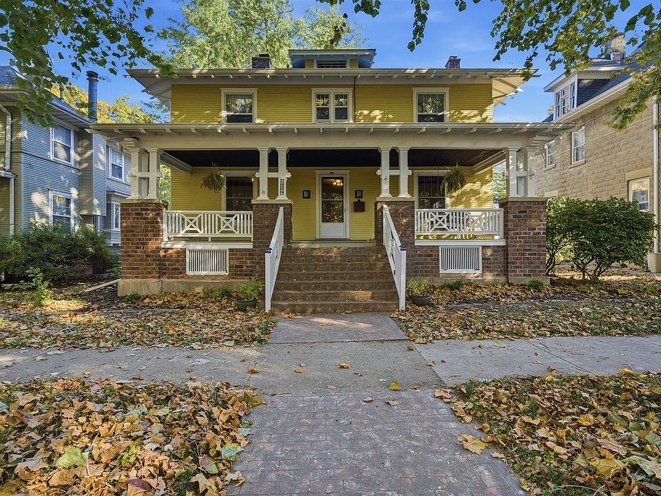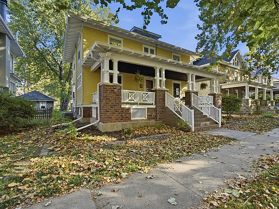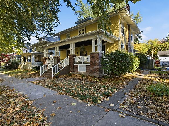 Step into timeless charm at 1209 N Clinton Blvd, a stunning historic four-square home in Bloomington's desirable White Place Historic District (not zoned S-4). Built in 1911, this thoughtfully maintained property offers modern comfort while honoring its architectural heritage through original woodwork, built-ins, and craftsman details throughout. This home enjoys the benefits of steam heat AND separate high velocity A/C system. The main level features a spacious living room with a wood-burning fireplace, an elegant formal dining room, and a bright sunroom-perfect for morning coffee or year-round enjoyment. The updated kitchen blends classic style with modern amenities, featuring quartz countertops, an island with seating, double oven, and a beautiful bay window. A small half bathroom finishes out the first floor. Upstairs, you'll find four generously sized bedrooms, including a 12x10 walk-in closet, plus one full bathroom and a half bath. The full basement offers even more space, partially finished for flexible living or storage options. Outdoor spaces shine with a cozy fenced yard, a newer patio and driveway for easy entertaining, and a rare three-car garage. Relax on the inviting front porch-recently structurally reinforced and tuckpointed in 2025-perfect for enjoying the tree-lined street. Additional updates include: New gutters (2021) Exterior paint (2022) Fresh interior paint in several rooms (2025) Boiler (2008 - prior listing). High velocity A/C systems (2001). Water heater (2020) Located close to parks, schools, shopping, and dining, this home offers a rare blend of historic character, modern updates, and a sought-after location. Don't miss your chance to own a beautiful piece of Bloomington's history.