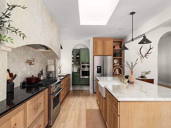 There is a lot to love about this home, but the kitchen will probably be your favorite space! 1209 Oak Meadow, in the heart of Dripping Springs, was recently remodeled to create a warm, beautiful retreat from the moment you walk through the front door. The open living/dining/kitchen area is the heart of the home. Wide plank, light floors are carried though most of the home and a floor to ceiling stone fireplace creates a cozy living space, with natural light flooding in from the back windows. The dining area is perfect for a table for six, with additional seating at the breakfast bar. The kitchen welcomes home chefs and those who like to keep the chef company! Recent additions include white oak custom cabinetry, quartzite countertops, a zelige backsplash behind a venetian plaster hood, and Devol British taps over an oversized farmhouse sink. Kitchen Aid appliances are in both the main kitchen and the prep pantry and include a 36” gas range, two ovens, a convection microwave, and dishwasher. The prep pantry is the dreamiest space with a sink perfect for trimming flowers or keeping the main kitchen clean, and extra counter space and storage. The primary bedroom is at the rear of the home and features shutters, a bay window, updated lighting, and a spacious bathroom with a corner shower and separate soaking tub. Near the front of the home is a guest bedroom with en-suite bathroom, and two additional bedrooms and a hall bath. This sweet home is situated on nearly one and a half, oak dotted acres and it backs to the Headwaters HOA land, with a dedicated greenbelt and walking/biking path. Enjoy quiet time anytime on the North/South facing porches on both the front and back of the home. There is plenty of space for gardening, a pool, or playing ball and plenty of storage between the two-car garage, storage shed, covered storage areas, and the RV storage. The roof was replaced in October 2025.