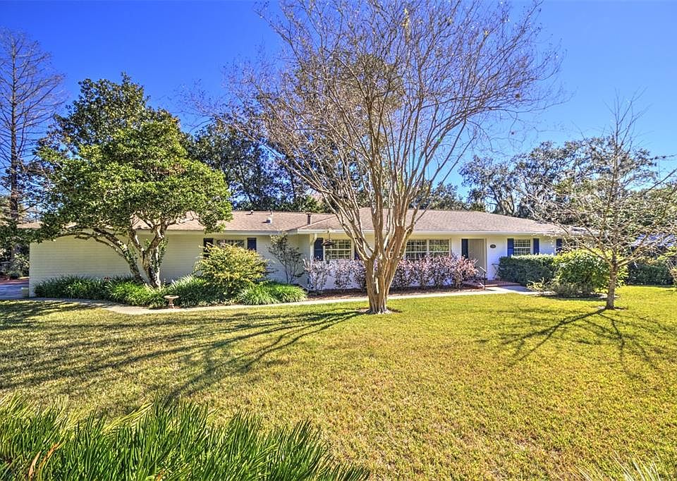 Beautiful 3/2 home in the sought-after southeast neighborhood of Woodfields, surrounded by million dollar homes. This home sits on a pristinely landscaped lot on over half an acre. Entering this mid-century home, you see what makes these homes unique, crown molding, built-ins, eat-in kitchen, formal dining room and Florida room. As you walk in the home you see the dining room to the left with large windows overlooking the front yard. Passing through into the kitchen there are ample solid wood cabinets storage and plenty of counter space and a breakfast nook area. Through the French doors is the wonderful Florida room with wood ceiling and painted brick walls. Walking through the large Family room you find the primary bedroom with sitting area and a full ensuite. There are also 2 other guest bedrooms and a guest bathroom. The laundry room comes complete with storage cabinets and a washer and dryer. The two-car garage has wood ceiling also with wood panel walls and 2 storage closets. Off the family room and out the French Doors is the alluring back patio perfect for entertaining or relaxing. The back yard has wonderful landscaping brick pathways and an adorable shed that would make a perfect she/he shed. Located in the golfcart area of Ocala. You can drive you cart to parks, schools or to the downtown square for dinner and shopping. This home is a must see.