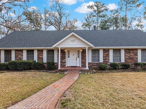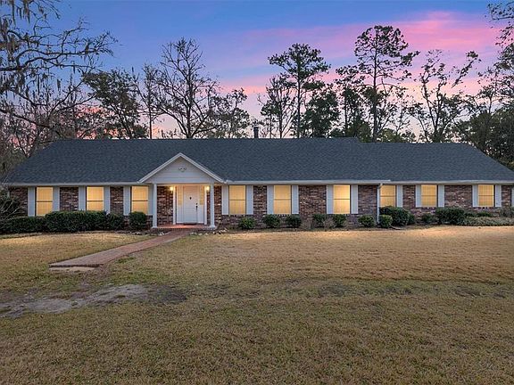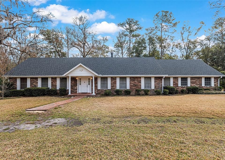 Graceful and quietly confident, this elegant single story residence offers a rare blend of privacy, space, and architectural character. With three bedrooms and two baths, the home sits on a sprawling, level lot shaded by mature trees, creating a peaceful rural setting with easy access to the city and interstate. A classic brick facade and charming brick walkway lead to the front door, setting a timeless tone from the start. Inside, parquet hardwood floors guide the way through a generous layout defined by strong bones and enduring design. The living room is anchored by exposed beam ceilings and an iconic fireplace, thoughtfully positioned between dual sliding glass doors that invite light and create an easy indoor outdoor connection. While some finishes reflect an earlier era, the home’s beautiful proportions, thoughtful layout, and architectural character reveal a depth of untapped potential ready to be thoughtfully reimagined. The adjacent kitchen follows an open flow, featuring classic millwork cabinetry that complements the warmth of the hardwood floors and architectural details overhead. A formal dining room with timeless chair rail detail and a versatile parlor with oversized windows add depth and flexibility to the floorplan, offering space for gathering, working, or creative pursuits. The primary bedroom is spacious and light filled, with multiple windows overlooking the surrounding greenspace and a well maintained ensuite bath. Secondary bedrooms provide comfortable layouts with good light, storage, and ceiling fans, supported by a carefully maintained secondary bath. Dual doors from the living room open to a brick and glass sunroom with tile floors, offering shaded enjoyment of Florida sunshine throughout the year. A rear entry two car garage and an exceptional lot size further elevate the opportunity. Elegant, idyllic, and full of potential, this home offers a compelling canvas for future vision rooted in classic appeal.