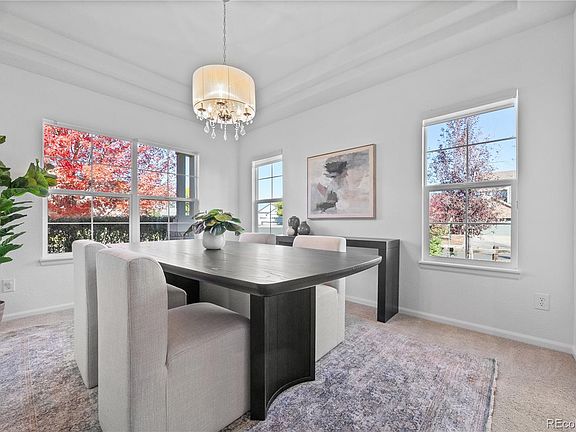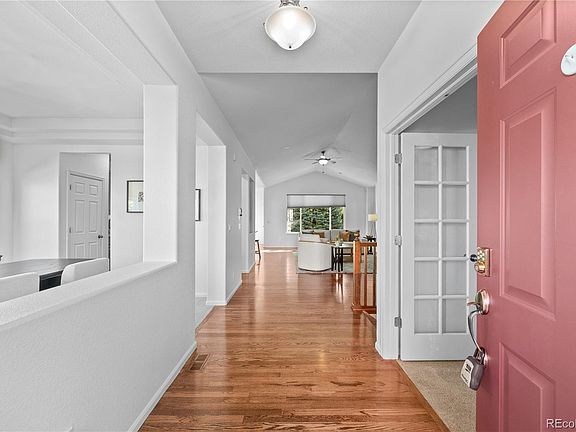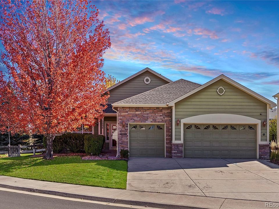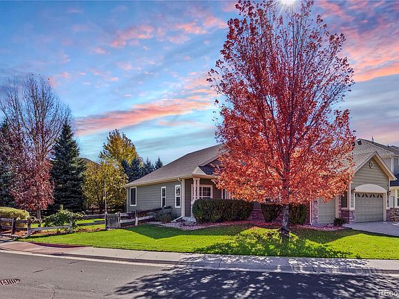 Perfectly located ranch-style home with vaulted ceilings, a 3-car garage, and massive finished basement — all set on a private, curved lot over 10,000 sq ft in desirable Canterbury Crossing. Enjoy everyday convenience with Cimarron Middle School a few blocks away and Legend High just down the street. Inside, the thoughtful layout offers 3 bedrooms, an office, and a dedicated dining room all on the main level. The central living room features soaring ceilings and a cozy fireplace — ideal for everyday living or entertaining. The primary suite is a true retreat with backyard views, vaulted ceilings, walk-in closet and a bright, updated five-piece bath. Downstairs, the spacious basement almost lives like a second home, featuring two large bedrooms, a ¾ bath, wet bar, generous rec room with fireplace, and ample windows for natural light. A 900 sq ft unfinished storage area provides endless options — think craft studio, fitness space, or even a golf simulator! Outside you'll enjoy plenty of privacy from mature evergreens mixed with fiery fall foliage, while the sizable corner yard allows plenty of room for relaxation or play. Lovingly maintained by the original owners, this home shines with quality updates: top-of-the-line Trane furnace and A/C (2020, $15K+), newer hot water heater (2023), updated appliances, designer granite countertops, refreshed bathrooms, newer roof (2019), gleaming hardwood floors, and fresh interior paint. Completely move-in ready and impeccably cared for — this home is ready to welcome you before the holidays!