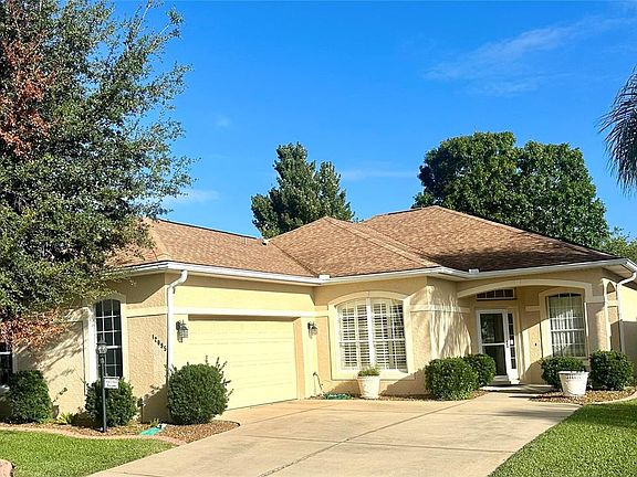 ++NEW LISTING- Additional photos will be added soon++ Welcome to STONECREST a beautiful and active 55+ Golf Course Community with 18 HOLE CHAMPIONSHIP GOLF COURSE, Broad Stripes Golf and Social Club with onsite restaurant, 4 swimming pools, pickleball & tennis courts, Bocce and shuffleboard courts, corn hole, softball field, walking trails and dog parks and over 90 groups offering something for everyone! This fantastic Kingsley Model is located directly on the golf course with fantastic views featuring 2 bedrooms, 2 baths and a bonus room equipped with lovely french doors that could easily be converted to a 3rd bedroom. NEW ROOF and SOLAR SYSTEM in 2022 that will be paid in full by the seller at closing offering very LOW power bills! This open concept Living, Dining area with kitchen bar has newer stainless steel appliances, neutral corian countertops, gorgeous custom crown molding and a fully enclosed lanai making this home perfect for entertaining. The spacious primary bedroom features luxury vinyl with a large walk-in closet and en-suite with double vanity, large tiled shower, separate soaking tub and enclosed water closet. STONECREST residents enjoy golf cart access to shopping, restaurants, retail shops, and entertainment with and a short trip to Spanish Springs Town Square in The Villages.