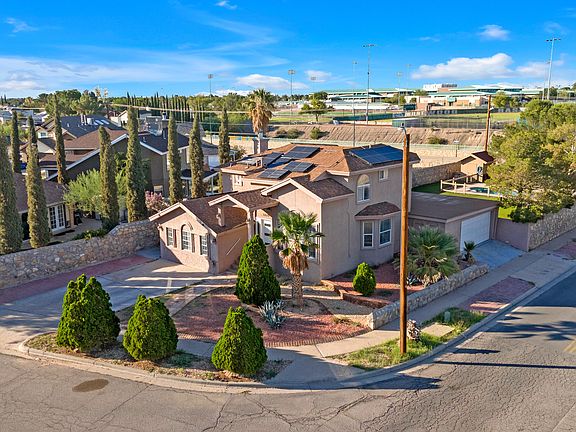 Step into a home that's equal parts stylish & functional! This multilevel beauty offers 4 spacious bedrooms, 2.5 baths, a versatile loft & multiple living areas that fit today's lifestyle. The converted garage has been transformed into a flexible game room or entertainment space, adding even more options for fun & relaxation. Inside, the kitchen blends modern white cabinets w/ butcher block counters, giving you a sleek yet warm space to cook, gather & entertain. Upstairs, the loft & balcony provide even more room to relax, work or play. But the real showstopper is the backyard; this oversized corner lot is unlike anything else in the area, offering the largest yard around complete w/ a sparkling pool that's ready for BBQs, pool parties, games or quiet afternoons soaking up the sun. Plus, enjoy completely paid-off solar panels for energy savings & peace of mind. Conveniently located near schools, shopping, dining, Loop 375 & Fort Bliss, this home delivers comfort, location & lifestyle in one amazing package!