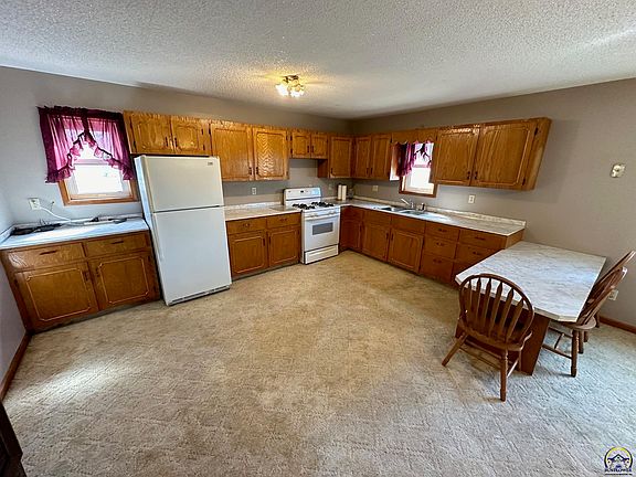Well maintained 2-bedroom a one-bathroom bungalow here with over 1400 sqft of living space. All main floor living with a very large eat in kitchen with a breakfast bar. Ample room for a large dining table here also. Generous living room with over 370 sqft to accommodate any furniture arrangement. Great closet space in the bedrooms with one having a walk-in. Other amenities to the home include: replacement windows, central heat and air (wall units no longer used), stove, fridge, and washer and dryer. Also check out the mudroom with the prep sink, extra storage, and easy access to the laundry. Outside one will find a detached 2 car garage with a storm shelter, a detached oversized one car garage, and storage shed/dog run. Don't overlook small town living here with an easy commute to Junction City, Manhattan, or Council Grove. Come take a look today!
