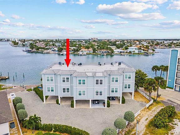 Charming waterfront townhome meets coastal serenity! Nestled at the peaceful end of a cul-de-sac on Treasure Island, this stunning residence at Bella Casa Townhomes captures the essence of sophisticated coastal living. One of only six exclusive units, this waterfront townhome offers beachy interiors, sweeping unobstructed views of Boca Ciega Bay, and the beach just a 5 minute stroll away. Situated directly on Devil’s Elbow Straight, a wide and picturesque stretch of Boca Ciega Bay, this home invites you to embrace life on the water. The community dock and seawall provide perfect spots for fishing or launching a paddle board, and a public boat launch is conveniently located just one block away (community slips can be rented or purchased from other owners when available). Inside, the home’s 10-foot ceilings and expansive windows showcase the beauty of the bay from every level. The kitchen is located on the second floor, where you’ll find granite countertops and painted cabinetry, complemented by stainless steel appliances. The host-friendly design flows effortlessly to the dining/ living area creating a seamless connection to the balcony. The 1st guest bedroom is also located on this level, adjacent to a full bathroom that can easily be enclosed for use as a guest or transient bath. On the 3rd floor, experience the most beautiful sunsets from the west-facing 2nd guest bedroom with double closets, ceiling fan and en-suite bathroom. Down the hall, the primary retreat offers tranquil water views, a spacious vanity with dual sinks, a spa-style soaking/jacuzzi tub, a separate shower, and a private commode room. Throughout the home, luxury vinyl plank flooring in the bedrooms, hallways, and stairs adds warmth and durability, while tile continues through all wet and living areas for easy maintenance. From your covered 2nd floor balcony, enjoy serene sunrises overlooking the water, or unwind in the evening with the colors of the sun setting over the gulf. Downstairs, the extended one-car garage, with direct interior access to the unit, has plenty of room for storage under the stairs. The garage can double as a cabana or entertainment space with its sliding doors leading out to the private covered patio with pavers just steps from the pool. Recent upgrades: New roof (2025), New hurricane-rated front door (2025), cleaned/re-grouted/resealed pavers (2025), new AC blower motor & UV light sanitizer system (2025), flooring on both staircases, updated guest bathrooms, upgraded fixtures throughout and new combo ventless washer/dryer. This property can be rented for three months or longer, making it an excellent choice for both investors and permanent residents seeking a refined coastal lifestyle. This community is also pet friendly so bring your furry friends! This home is perfectly positioned to offer both tranquility and convenience. It's within walking distance to the beach, grocery stores, pharmacies, beach bars, and some of Treasure Island’s finest waterfront restaurants. Also an easy 30-minute drive to Tampa International Airport, St. Pete–Clearwater International Airport, and the award-winning Fort De Soto Park. With panoramic bay views from every level, modern upgrades, and timeless coastal charm, this exceptional townhome is more than a residence - it’s a lifestyle defined by water, light, and ease. This home offers the very best of waterfront living on Florida’s Gulf coast - a true gem on an island full of treasures!