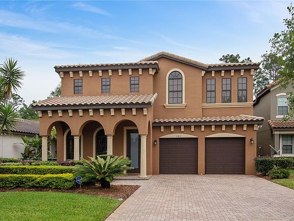 Model home with all the extras, located in gorgeous Riviera Bella, a waterfront community with private boat ramp! The kitchen has granite countertops, stainless steel appliances, 42" cabinets with pullout drawers, tile floors in the kitchen, family room, dining room, living room and bathrooms. Beautiful courtyard with brick pavers and privacy landscape. The Master bedroom has a balcony that over looks the courtyard and a second screened balcony that looks out to the fenced backyard and conservation area behind this exclusive home. Maintenance of lawn is included along with an elegant community club house that has an award winning pool, state of the art workout gym, video area, bar and several meeting rooms. The Upstairs of this home includes its very own media room, 4 bedrooms and 2 bathrooms. The upstairs has the convenience of the laundry room being close to all bedrooms. Walkout to the backyard thru large sliding doors that take you to a trussed, screened lanai. There are 3 sets of large slider doors that walkout to the courtyard patio in the center of this beautiful home. This model has all the bells and whistles, crown molding throughout, brick paver driveway, incredible curb appeal, two balconies off the master suite, security system, wired sound system, and arches throughout. This home is perfect for entertaining, inside and out!