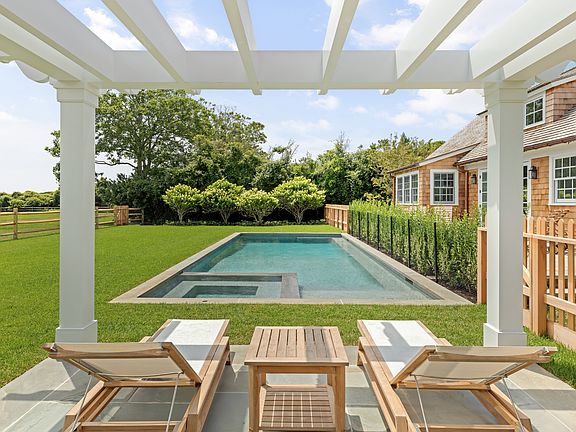 away. This property offers a rare combination of seclusion and proximity to the area's attractions. Thoughtfully designed for modern living, the interior of 121 Apaquogue Road boasts custom millwork throughout, rich hardwood flooring, and a seamless connection between indoor and outdoor living spaces. The chef's kitchen is outfitted with custom wood cabinetry, a Wolf gas stove, Sub-Zero refrigerator and freezer, dual Bosch dishwashers, and Pennsylvania Bluestone countertops. A wood-burning fireplace is the centerpiece of the spacious great room, which features a wet bar and multiple access points to the exterior covered porch. 121 Apaquogue Road is a true East Hampton Village retreat. This thoughtfully designed home blends luxury, comfort, and tranquility, providing an ideal setting for those seeking a relaxed yet refined lifestyle. With its prime location and quality amenities, it's the perfect summer escape.