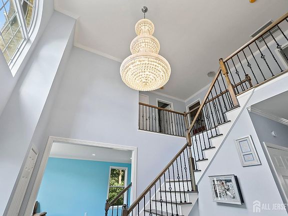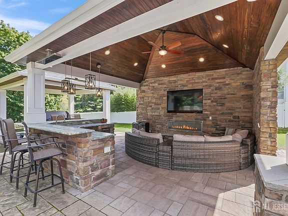 Welcome to this beautifully maintained brick-front 5-bedroom, 2.5-bath Colonial located in the highly desirable Junction Trail community, set on a private 1.12-acre lot. Built in 1999, this home features an upgraded kitchen with antique off white cabinets, a center island, stainless steel appliances, and an eat-in kitchen with a slider leading to a large paver deck. The family room boasts a wood-burning fireplace with updated stonework and plantation shutters. Convenience abounds with one bedroom on the main level, perfect for a home office, guests, or multi-generational living. Both full baths have been recently renovated, offering modern comfort. Other upgrades include a new roof, updated railings, laminate flooring, a hot water heater, and a new AC unit. The fully finished basement offers versatile additional living space, ideal for a recreation room, home gym, or extra storage. Outside, enjoy your private backyard oasis, equipped with infrared heaters, pendant lighting, a built-in fridge, ice maker, jacuzzi, and 220-amp electric service. The ample backyard space is also perfect for a swimming pool. With only one neighboring home, this property offers an added level of seclusion. Located close to NYC transportation, major highways, and shopping centers, this home is also part of a top-rated school system, specifically the Freehold Regional High School District.