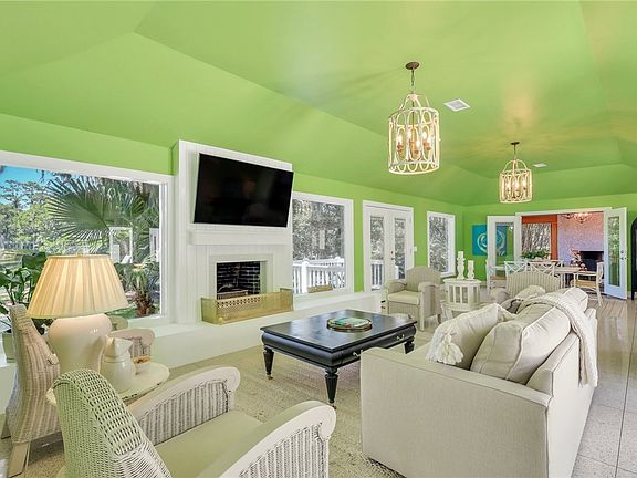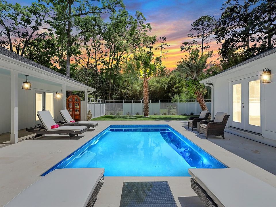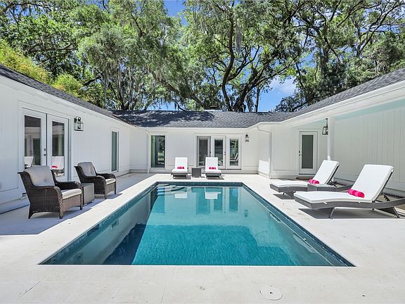 Open House: November 6th, 11:00 a.m.- 2:00 p.m. Completely Remodeled Coastal Retreat with New Screened Porch & Heated Pool! 121 Colonial Drive sits on almost three-quarters of an acre, featuring beautiful live oaks and a lush tree canopy. The 4-bedroom, 3.5-bathroom estate is nestled in the tranquil, oak-lined Sea Palms golf course neighborhood. With a perfect blend of modern luxury, coastal charm, and prime location, this property offers resort-style living just minutes from the beach. Step inside and you’ll discover spacious, light-filled interiors adorned with vibrant, stylish décor and open concept living spaces. The gourmet kitchen features a large island, all-new appliances, and seating, ideal for entertaining. Adjacent common areas flow seamlessly into a vaulted screened porch with a fireplace, creating a comfortable indoor/outdoor living experience. The home is designed for comfort and privacy, offering two primary suites (each with a king bed and en-suite bath), situated on opposite sides of the house. Two additional guest bedrooms share a full bath, making this layout well-suited for any family. Outdoors, enjoy your private heated pool, surrounded by a fenced yard—including a pet-friendly area—offering both privacy and functionality. Multiple French doors open directly onto the pool area, seamlessly integrating indoor and outdoor spaces. The lot backs to the 12th fairway, providing serene golf-course views and a peaceful backdrop.