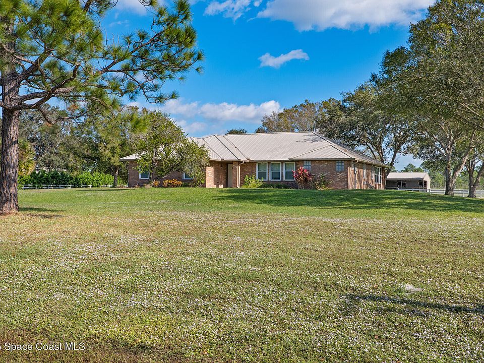 Plenty of space on this 2.69 acre property in an equestrian community. This 3 bedroom, 2 bath brick home has a large enclosed porch with a relaxing view of the barn and pastures. Large, magnificent oak trees provide beauty and shade. Newer metal roof, impact windows, whole house generator, heat pump, and 3 car garage. Well laid out floor plan offers a large family room and split bedrooms with walk-in closets in all 3 bedrooms. Primary bath has double sinks and a large shower. Kitchen has an island, pantry, and water filtration system. High ceilings, flooring is LVP and tile. The 1,250 square foot barn has 2 stalls, tack/feed room, water/electric, metal roof, and equipment garage. Attractive 3-rail vinyl fencing completely encloses the large pasture and turn out area. Low HOA fee of $230 yr Property is conveniently located to the community entrance with access to the St Johns Heritage Parkway and I-95. Well maintained clubhouse, tennis/ pickleball/basketball court and two riding arenas.